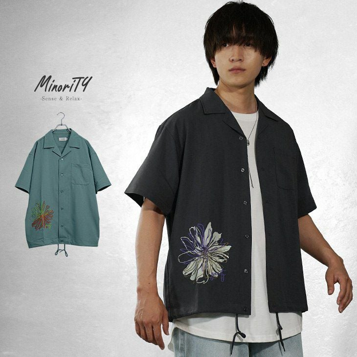 【フラワーオープンカラーシャツ】フロントとバックに、鮮やかなフラワー刺繍を施した半袖シャツ。シャツ特有の綺麗めな印象と、刺繍デザインによるカジュアル感が相まって、綺麗めカジュアルな夏の装いが完成◎オープンカラーのデザインは夏らしい爽やかな印象を加速させ、首元が重たくなりすぎず、すっきりと見えます。素材は薄手でありながらも、透け感はなくさらっとした肌ざわり。柔らかさの中にハリもあるので、上質感を感じられる着心地を実現します。