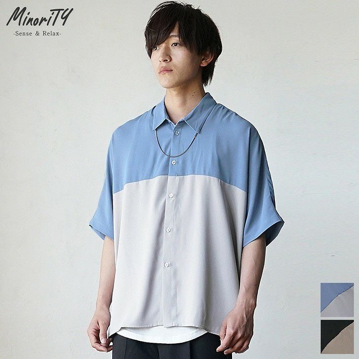 【バイカラー半袖ビッグドルマンシャツ】上下で配色が切り替わったバイカラーシャツ。上品なカラーリングでの切り替えになっており、加えてレギュラーカラーシャツなので、カジュアルになりがちな夏コーデを上品に楽しめます。シルエットは身幅がゆったりとしたドルマンシルエットなので、こなれた印象になりカッチリし過ぎないのがポイントです。生地はさらりとしたポリエステルを使用しており、汗をかきやすい夏も快適に着用していただけます。