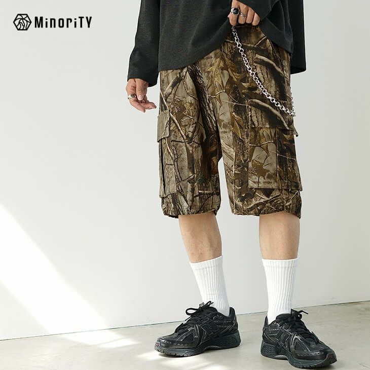 パッと目を惹く、リアルツリーカモフラージュの柄がプリントされたハーフパンツ。ゆったりとワイドなシルエットとカーゴパンツのデザインでカジュアルな夏のコーデに最適なボトムスに。目を惹くデザインながら、落ち着きを感じる配色で雰囲気抜群。
