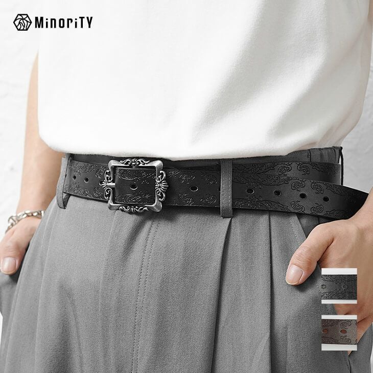 【レリーフPUレザーベルト】●DESIGN(デザイン)「エレガントを纏う」バックルだけでなくベルト部分にもデザインが施され、どこかエレガントな雰囲気が漂うベルト。トップスをタックインしてベルトを魅せるなどコーデの幅が広がるアイテムです。