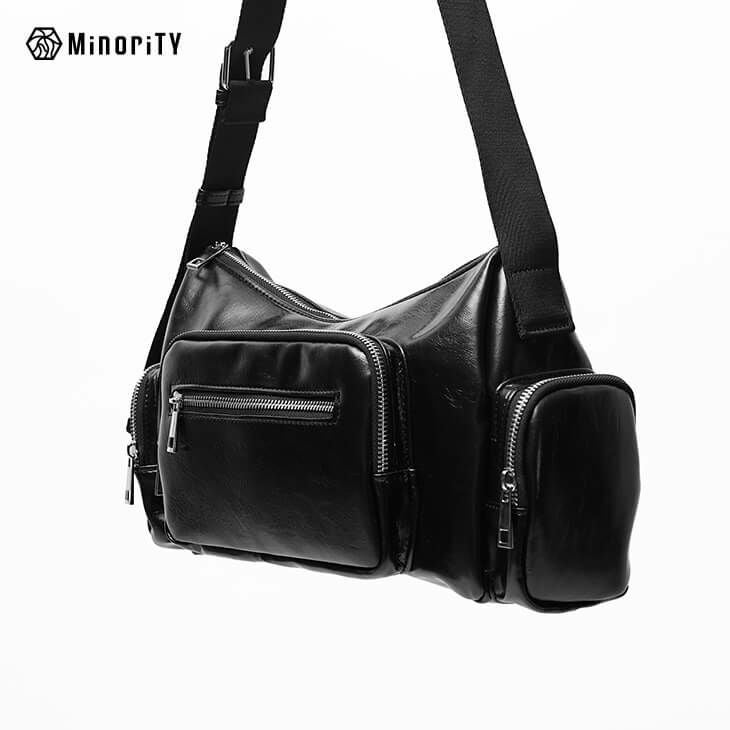 【ポケット合皮ショルダー】●DESIGN(デザイン)「大人ミニマルな煌めき」トレンドの長方形バッグの要素を取り入れたミニマルなデザインのショルダーバッグ。両サイドやフロントに配置されたジップ付きのポケットで小分けにして収納可能。大人な上品さをもたらしてくれるショルダーバッグです。