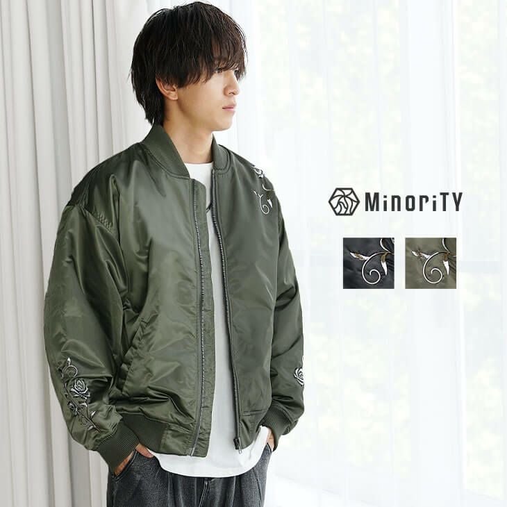 【ポリヘビーツイル刺繍中綿ブルゾン】ミリタリー系の中綿ブルゾンに、華やかなフラワー刺繍を施すことで柔らかさをプラスした「ソフトミリタリー」アイテム。身幅を十分に取ることで中に着こんでもゴワゴワしないので冬の防寒アイテムとしてもバッチリです。さらに、中綿が入っているうえに裏地はキルティング仕様なので保温性も抜群!無骨な中綿ブルゾンに華やかさが加わった、MinoriTYらしい柔らかアイテムが完成しました。