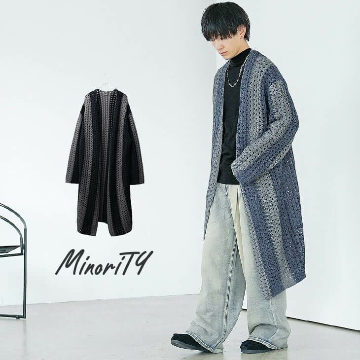【クロシェロングガウン】今季のトレンド「クロシェ編み」を採用した超ロング丈のガウン。同系色の太めストライプがスタイルを良く見せてくれます。透け感のある編地がヌケ感を与え、野暮ったく見えないのもポイント。また、ガウンの前止めができるように安全ピンを付属しております。また同色・同素材のマフラー(商品番号:67602)と合わせることで、グッとおしゃれな着こなしを実現します。