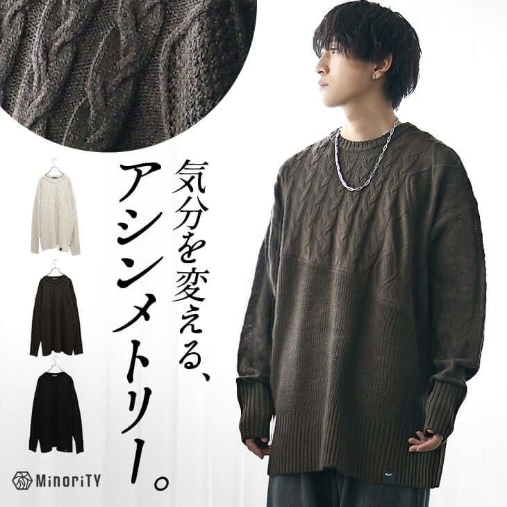 異なる2つの編地を左右非対称に組み合わせたニット。ケーブル編みとリブ編みの切り替えデザインが1枚でコーデを完成させます。お尻が隠れるほどのロング丈とリラックス感のある着心地です。ゆるっとしたシルエットがさり気なく体型カバーを叶えるアイテムです。