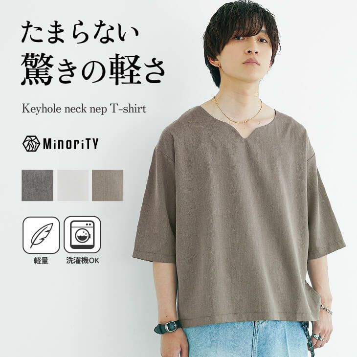 首元が大胆に開いた「キーネック」のデザインが程よい色気を引き立てる半袖Tシャツ。夏の爽やかさとカジュアルな抜け感が両立された夏のトップスです。首元にアクセントの効いたアイテムなのでTシャツ一枚のスタイルでもサマになり、ラフさはありながらも洗練されたコーデに仕上がります。