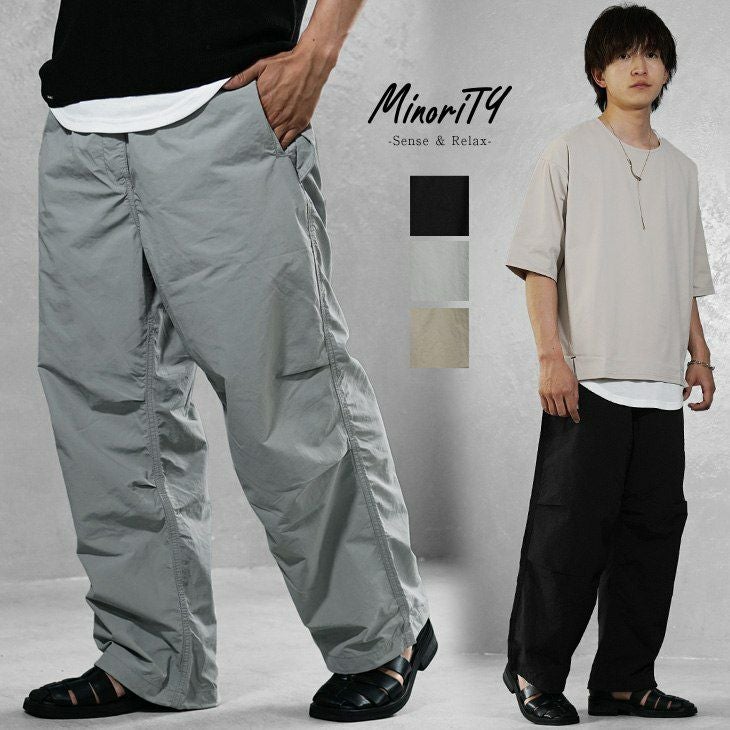 【パラシュートパンツ】軽やかなさらさら生地で夏でも快適に穿くことができるシャカパン。裾に付いたドローコードを引っ張ることでストレートシルエットとバルーンシルエットの2通りの着こなしを楽しめます。ウエストゴムと紐が付いた穿きやすさへのこだわりに加え、ファスナー付きポケットでポケットの中の荷物が落ちない仕組みに。夏でも快適にストレスなく過ごすことが出来るイージーパンツに仕上がりました。