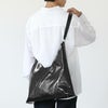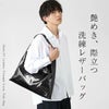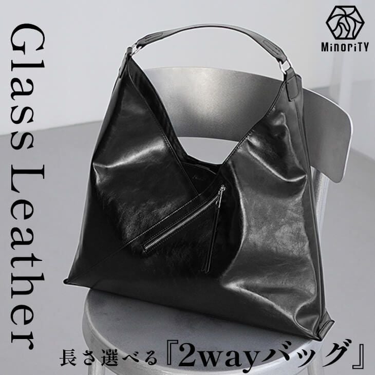 上質なガラスレザーが生み出す艶やかな光沢と洗練されたシルエット。トライアングル型で角をつくることによって、エッジを効かせたモード感を表現したトートバッグです。長短2種類の紐が付属されているので、用途に合わせて使い分けることも可能◎シンプルながらも存在感を放つ、大人の品格を引き立てるバッグです。