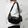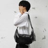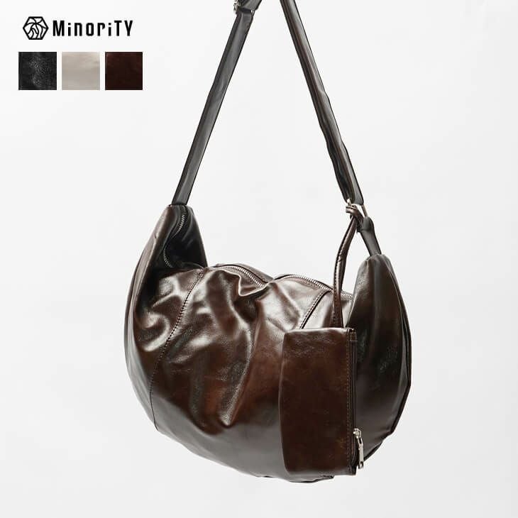 【グロッシーフェイクレザーハーフムーンショルダー】●DESIGN(デザイン)「艶めきを携えて」なめし革のような高級感のある輝きをもったフェイクレザーのショルダーバッグ。半月型のデザインながら大きめのサイズ感で、収納力も抜群です。またミニポーチも付属しており、小さなものやよく使うものをすぐに取り出せるのも特徴的なバッグです。