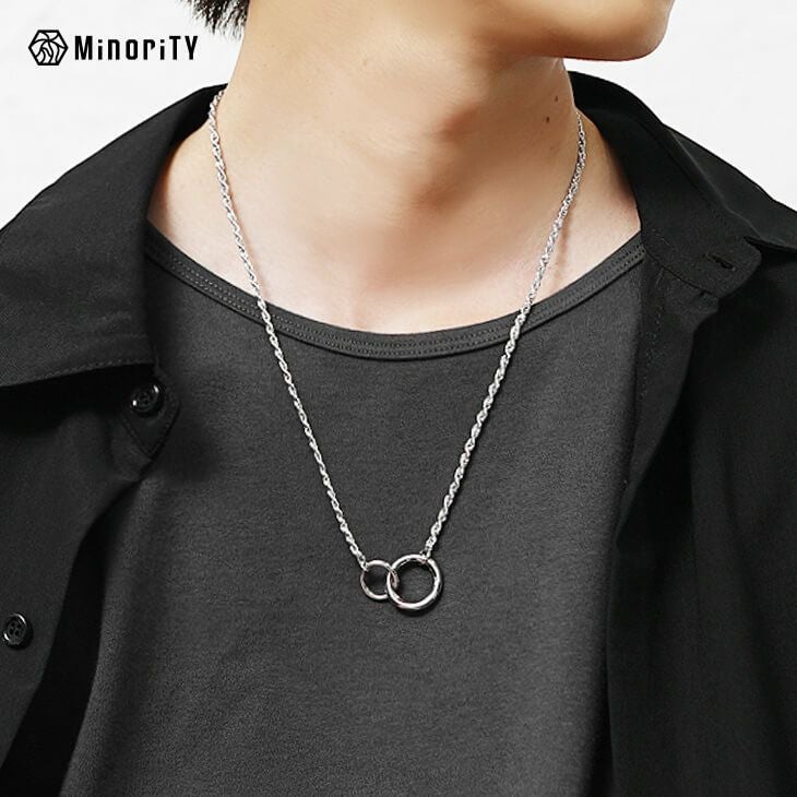 大小2つのリングをつないだネックレス。シンプルながらも特徴的なデザインがどこかクセになるアクセサリーです。シンプルなデザインなのでどんなコーデにもマッチし、使いやすさ抜群のアイテムです。