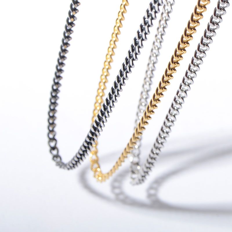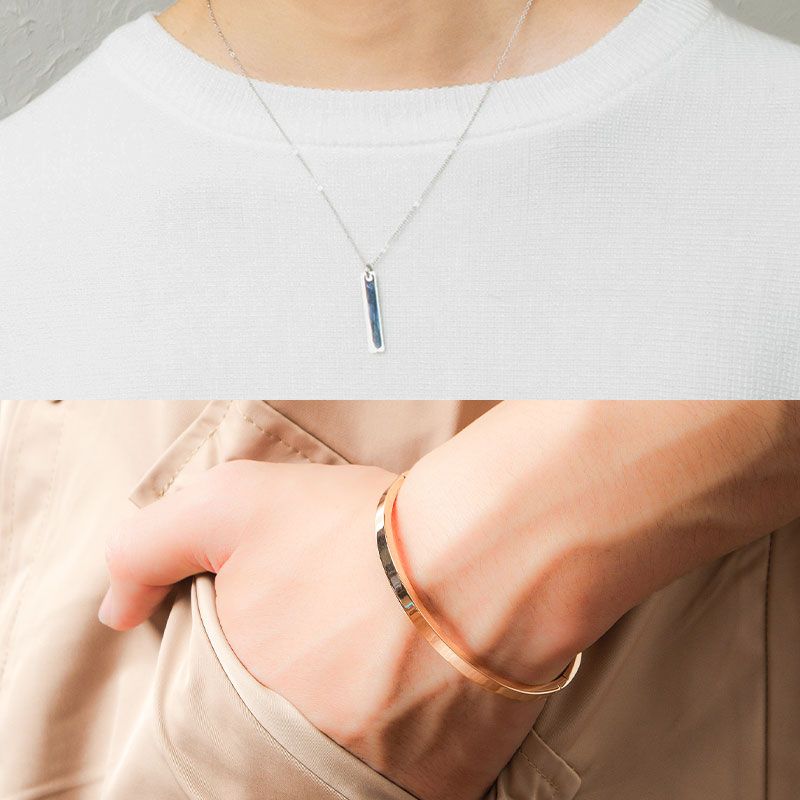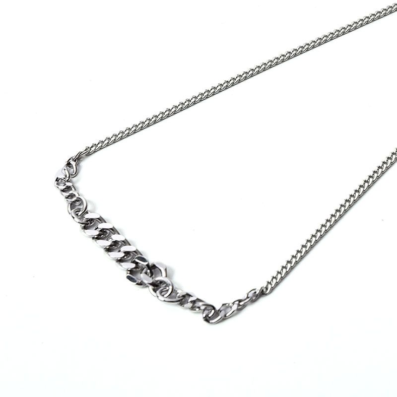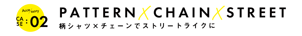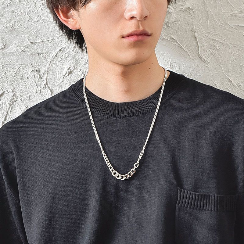 シルバーのチェーンネックレスで、ピリっとアクセントを加えて。