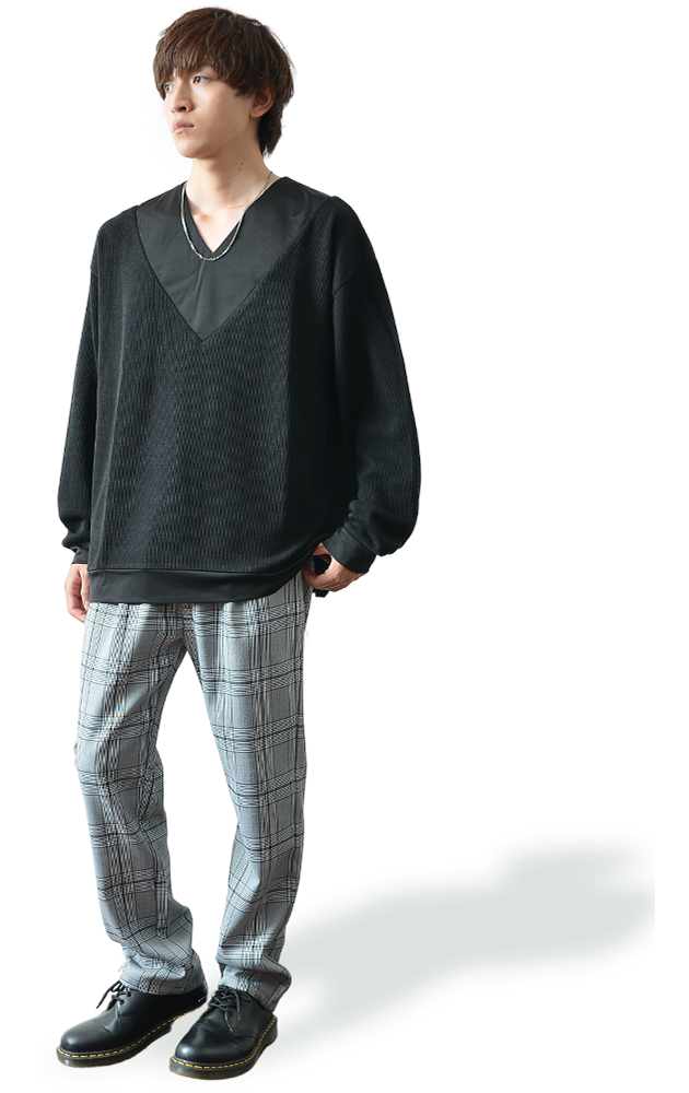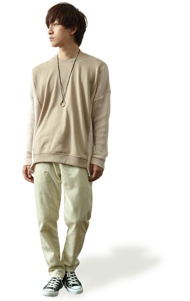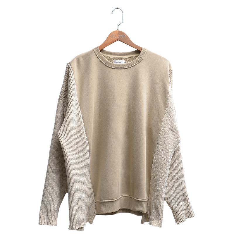トレーナーのような素材とニット生地の切り替えデザインのアイテム。