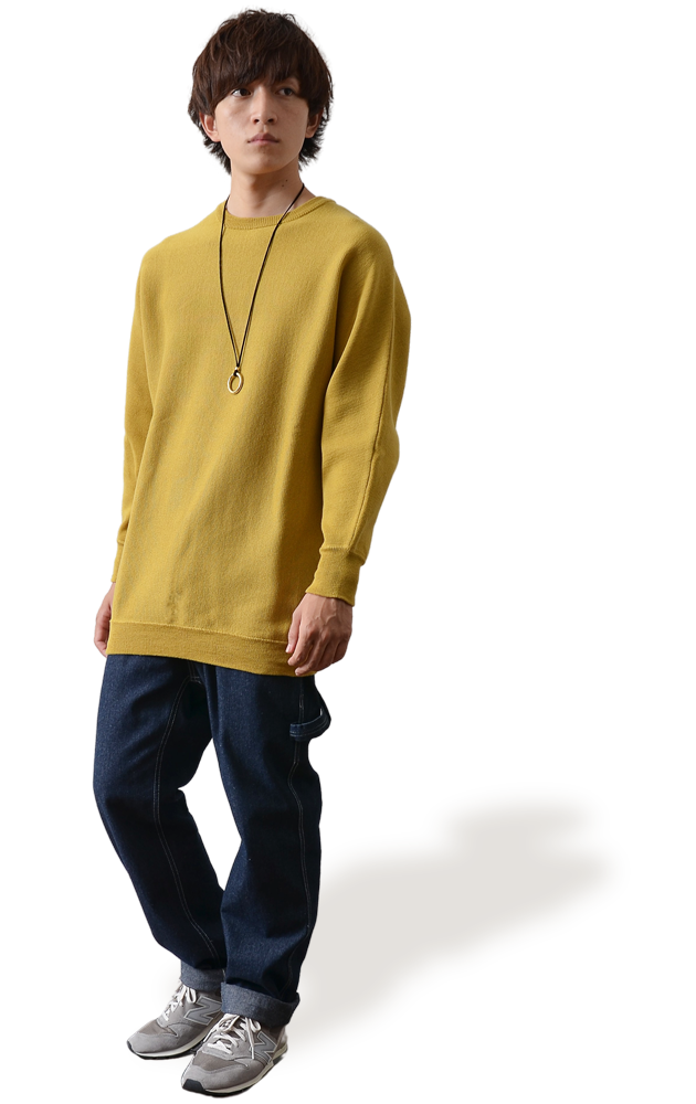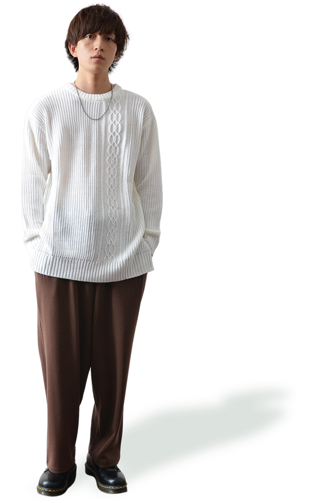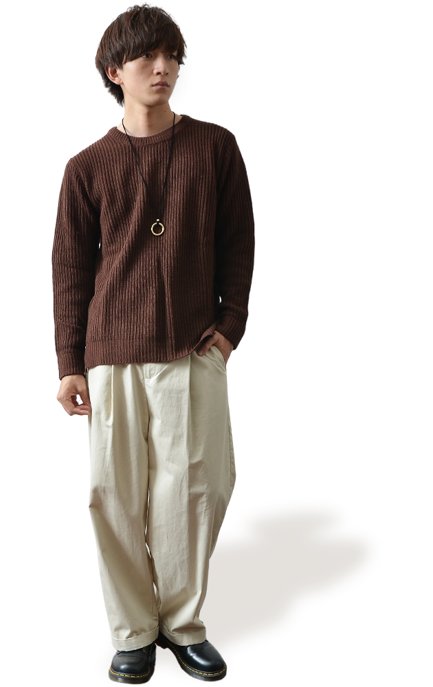 シンプルな編地のニットだからこそ、ボトムスのデザインを引き立ててくれます。