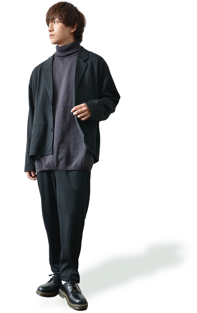 首元にボリュームのあるタートルネックには、すっきりとしたアウターを合わせるのがオススメ。