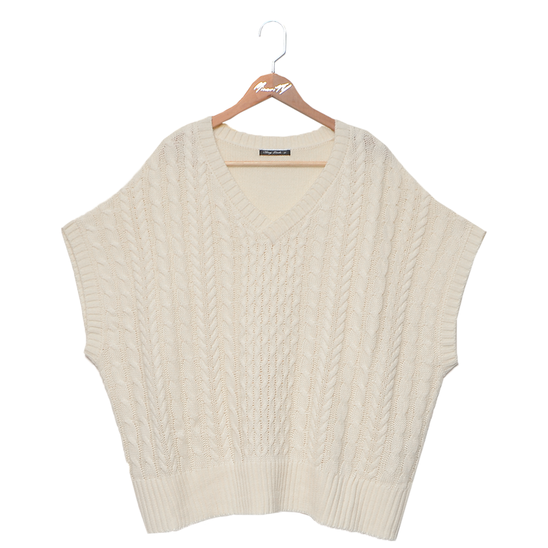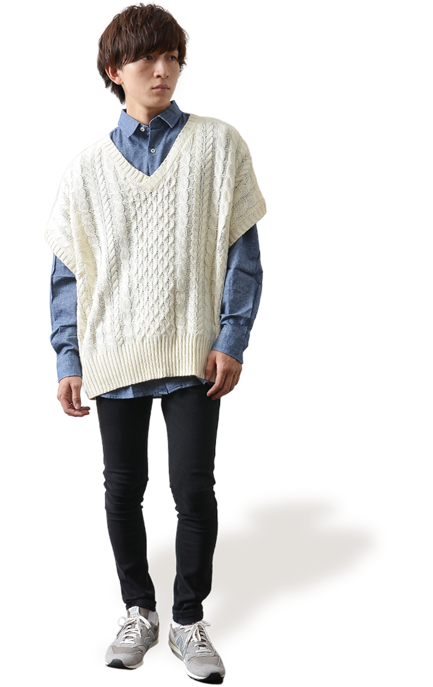 ケーブル編みのベストで知的なイメージを。