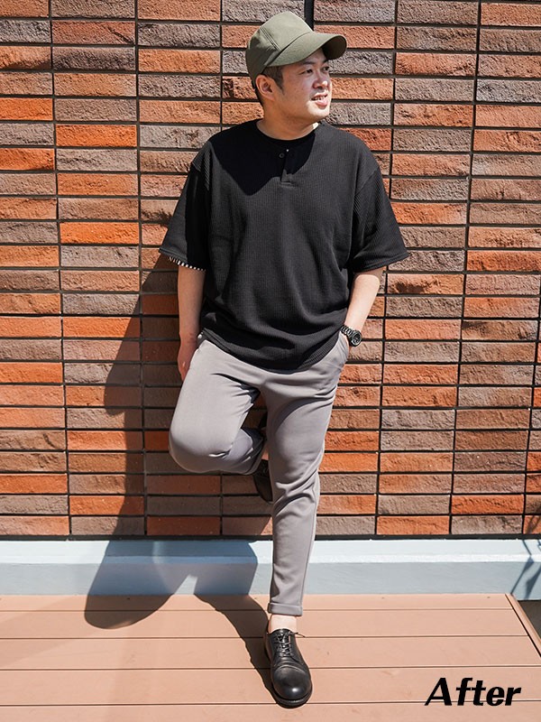 ・ボトムスの色に寄せたトップスで引き締める
