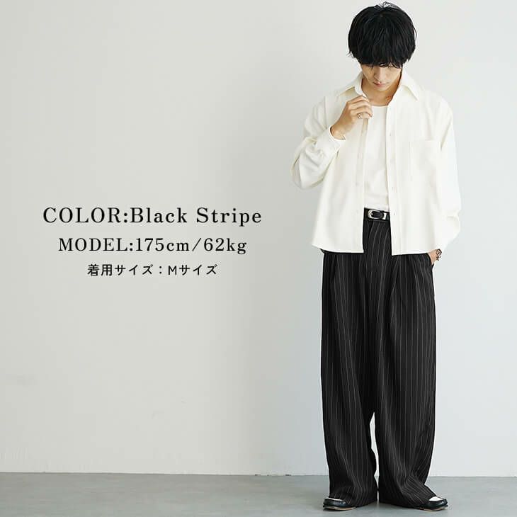 清潔感のある白シャツに、黒のストライプ柄ワイドパンツを合わせたモノトーンスタイルです。 トップスは羽織りとしてラフに使い、ボトムスで縦のラインを強調してスタイリッシュさをプラスしています。 全体的にゆったりとしたシルエットで、大人の余裕を感じさせる着こなしです。
