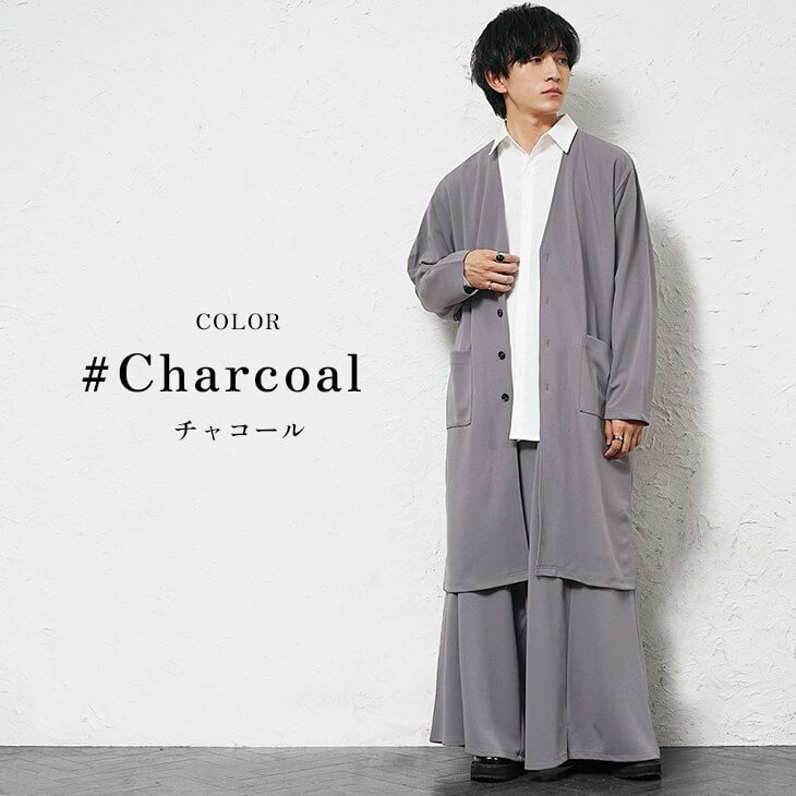 チャコールグレーで統一した、洗練された雰囲気のモードスタイルです。 ロング丈のカーディガンが縦のラインを美しく見せ、同素材の極太ワイドパンツが足元に重厚感を演出します。 インナーに白シャツを挟むことで、重くなりすぎずクリーンな印象に仕上げています。