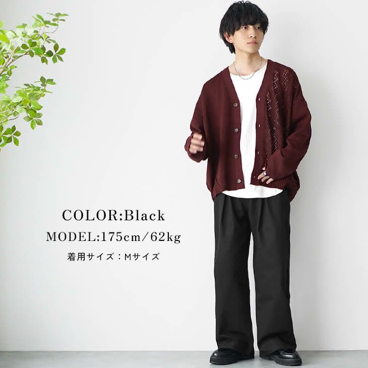 深みのあるワインレッドのカーディガンを主役にした春らしいコーディネートです。 トップスは片側に透かし編みのデザインが施されており、さりげない個性を光らせています。 ボトムスにはシンプルな黒のワイドパンツを合わせ、全体のトーンを落ち着かせた大人カジュアルです。