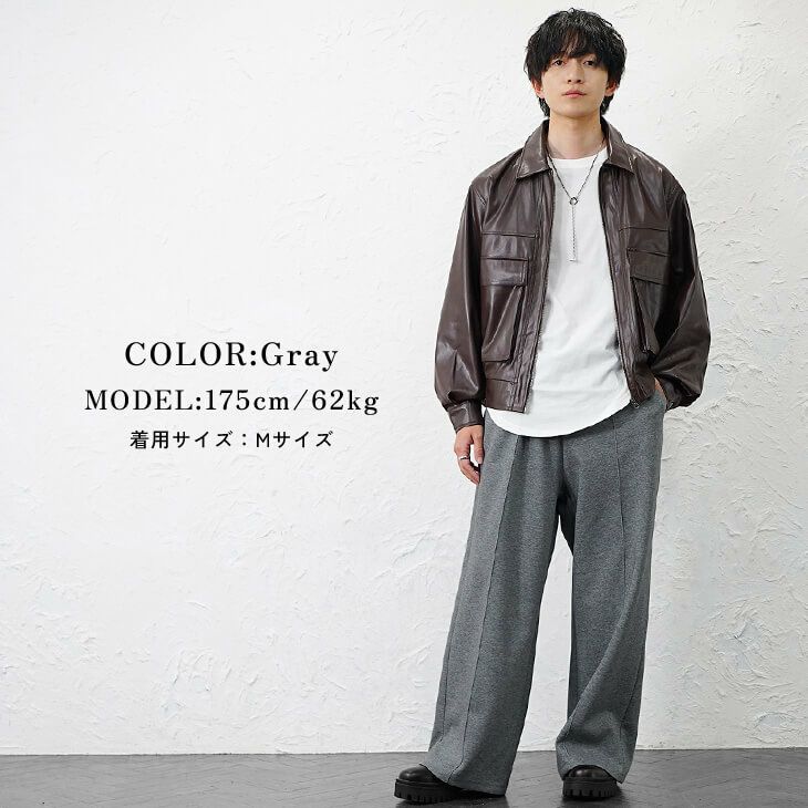ハードな印象のレザージャケットを、柔らかなアイテムで中和した都会的スタイルです。 ブラウンのフェイクレザートップスに対し、ボトムスはセンターシーム入りのグレーのリラックスパンツを採用しています。 素材のコントラストを効かせた、程よい抜け感のある着こなしが特徴です。