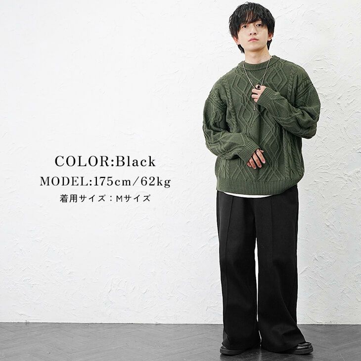 春らしいオリーブグリーンのニットを主役にした、春の定番リラックススタイルです。 立体的なケーブル編みが特徴のトップスに、シンプルな黒のワイドパンツを合わせてメリハリをつけています。 ゆったりとしたサイジングで、気取らない自然体な魅力を引き出しています。
