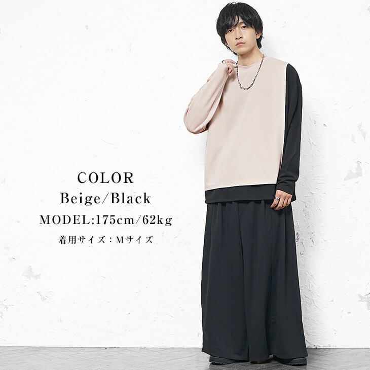 ベージュとブラックの配色が目を惹く、洗練されたモードテイストのコーディネートです。 トップスはアシンメトリーなバイカラーデザインで一枚でも主役級の存在感を放ちます。 ボトムスにはボリュームのある黒のワイドパンツを合わせ、Aラインを意識した綺麗なシルエットにまとめています。