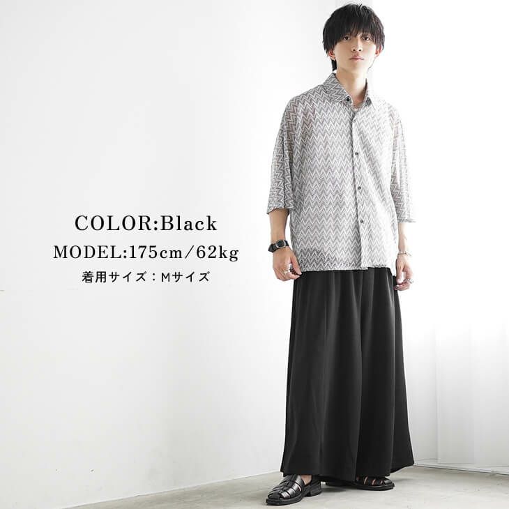 幾何学模様の半袖シャツをさらりと着こなした、涼しげなサマースタイルです。 主張のある総柄トップスも、モノトーンベースなら落ち着いた印象にまとまります。 ボトムスにはとろみのある黒のワイドパンツとサンダルを合わせ、リゾート感漂うリラックスした雰囲気を演出しています。
