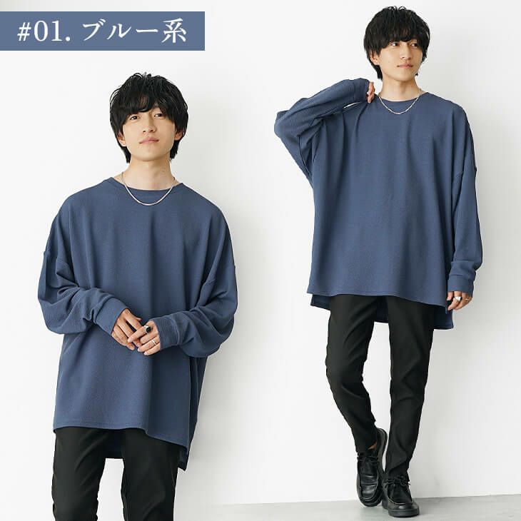 ブルーのオーバーサイズトップスを主役にした、シンプルなカジュアルコーディネートです。 ドロップショルダーで丸みのあるゆったりとしたトップスに対し、ボトムスは細身の黒パンツを合わせてVラインシルエットを構築しています。 メリハリの効いたバランスの良さが全体をすっきりと見せます。