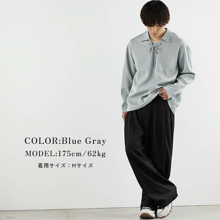 絶妙なブルーグレーの色合いが爽やかな、こなれ感のあるコーディネートです。 胸元のレースアップデザインと表面感のある生地が特徴のトップスに、落ち感のある黒ワイドパンツを合わせて上品に仕上げています。 シンプルながらもディテールにこだわりが光る、大人の洗練されたスタイルです。