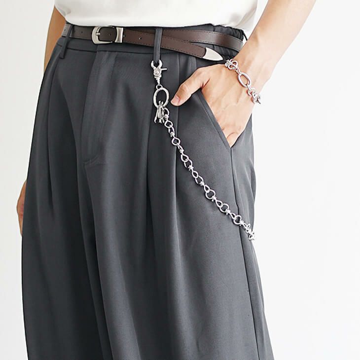 またパンツのシルエットが細身なら細めのチェーン、ワイドパンツなら太めのチェーンといった具合に、バランスを調整すると全体の統一感が生まれます。