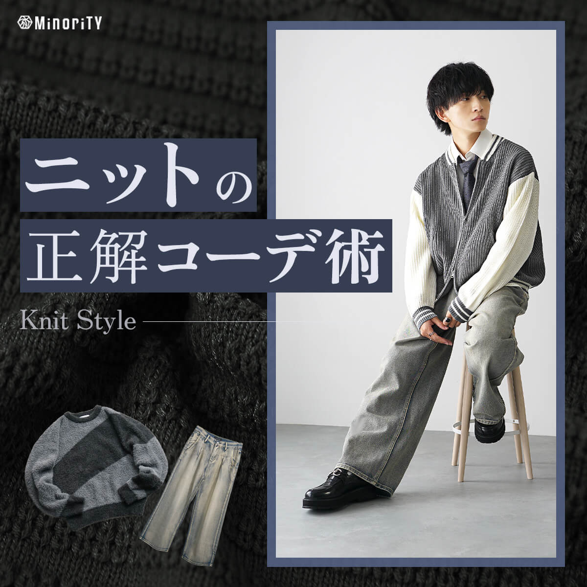 ここからは、セーター使った、具体的なメンズのコーデについてご紹介していきます。 なお、ここで紹介するアイテムは、MinoriTYの公式オンラインストアから購入できますので、ぜひチェックしてください。