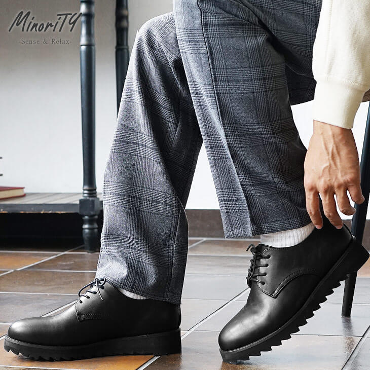 セットアップを大人っぽく着こなすのに、革靴(レザーシューズ)はもってこい。 しかもシャークソールの厚底なので身長高見え効果もあり、よりセットアップが着こなしやすくなるので、是非低身長さんは取り入れてほしいアイテムです。