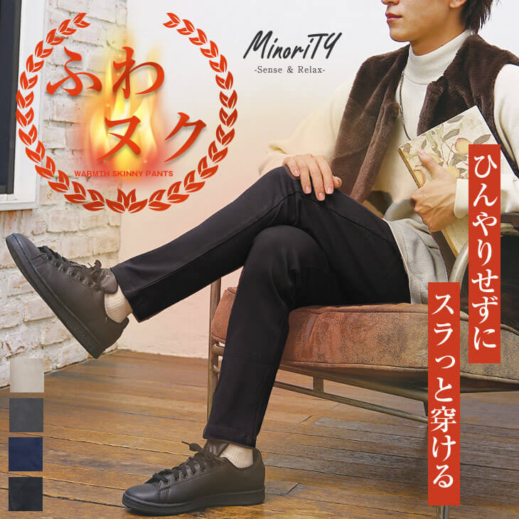 肌寒くなってくる10月11月の秋コーデ。まだコートは早いという時に寒さ対策として裏起毛の暖かパンツがおすすめ。 冬真っただ中にも穿けるからコスパも良いし、着回し力も抜群。トップスにはニットを合わせて難しいコーデは必要なくてもおしゃれコーデが完成します。