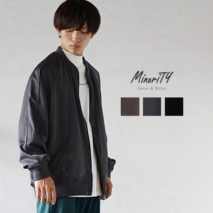 サテン生地の光沢感によって綺麗めな印象になるMA-1型ジャージ。 袖部分に同色のサイドラインが入っていることでスポーティーな雰囲気を出しながらも、綺麗めなニットやシャツとも親和性の高いデザインなので普段使いに取り入れやすいライトアウターです。 同素材のワイドパンツと合わせてセットアップとして着用すれば、シックな色味で大人っぽく着こなすことができる、洗練されたコーデが完成します◎