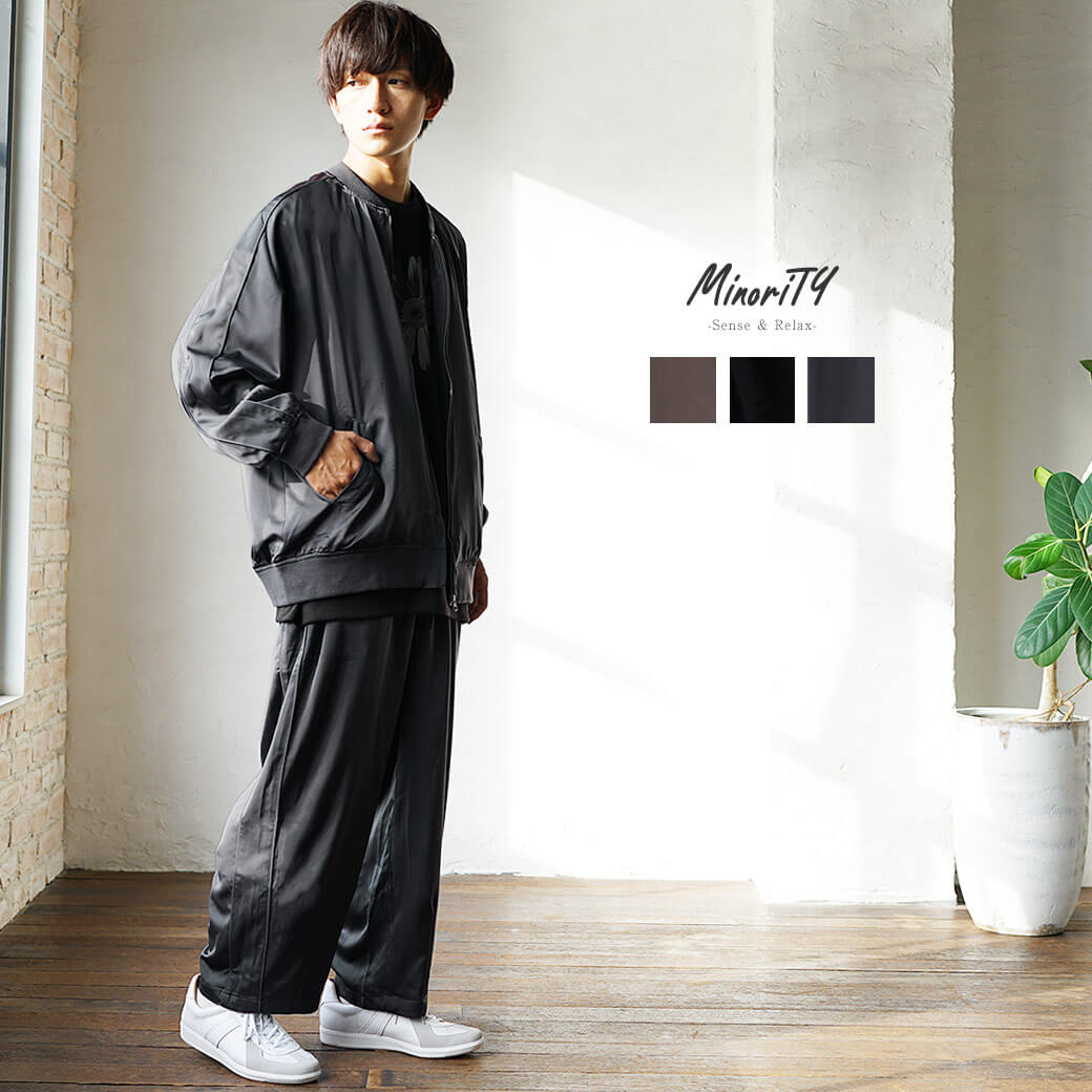 シンプルなMA-1の形をベースにしたセットアップは、大人のメンズにぴったりのアイテムです。 ブルゾンはニットの上にも羽織れるゆったりとしたシルエットで、ワイドパンツはすとんと綺麗な落ち感があります。 とろみサテンの素材が上品で柔らかな印象を与え、少しくすんだ色味がトレンド感を演出します。
