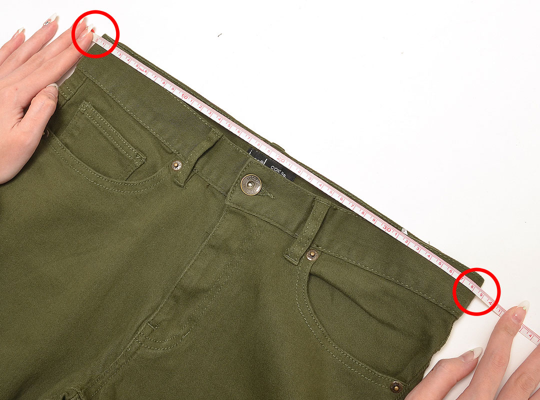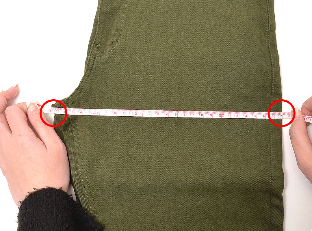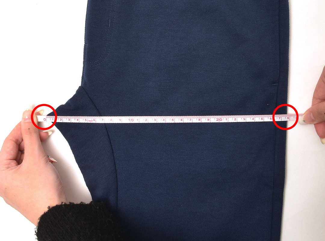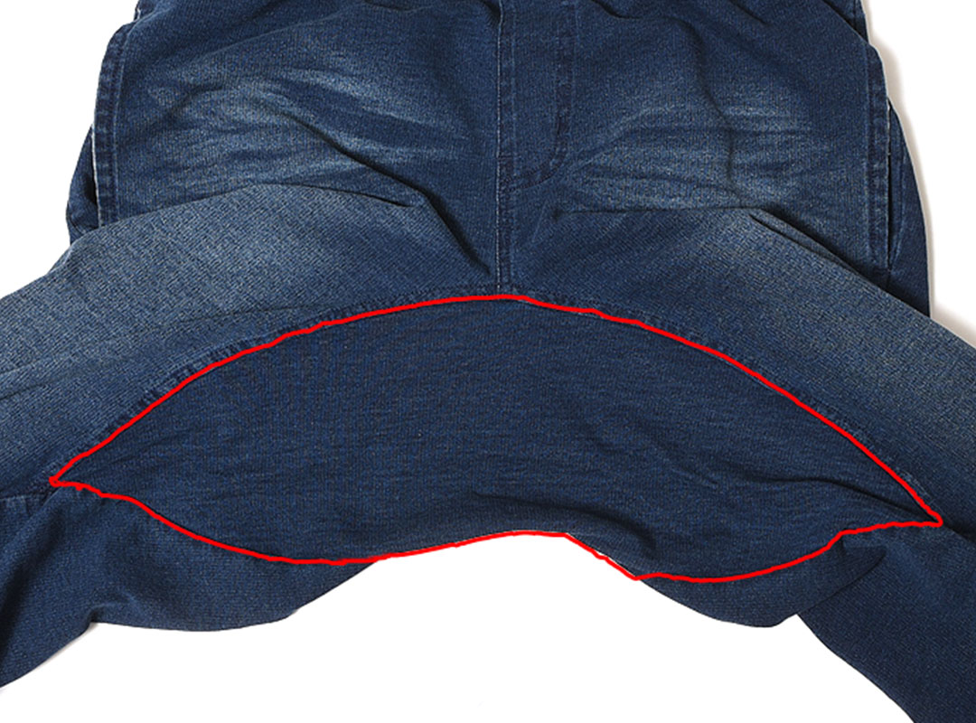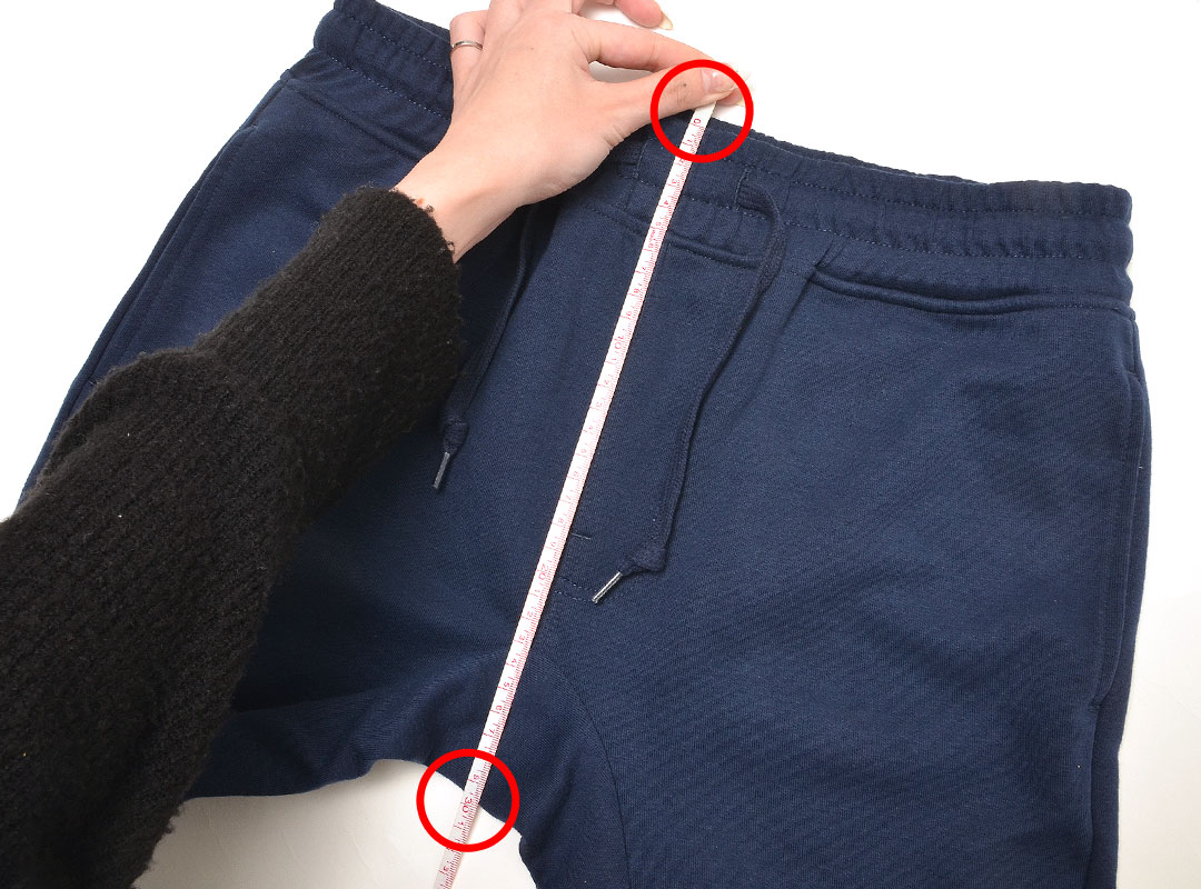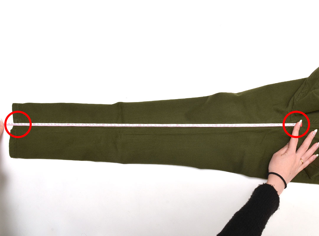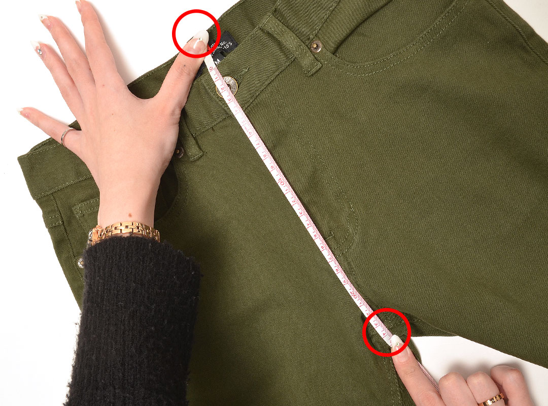 股に布の切り替えがあるもの(赤線)は、次の股上と股下の測り方で計測しております。